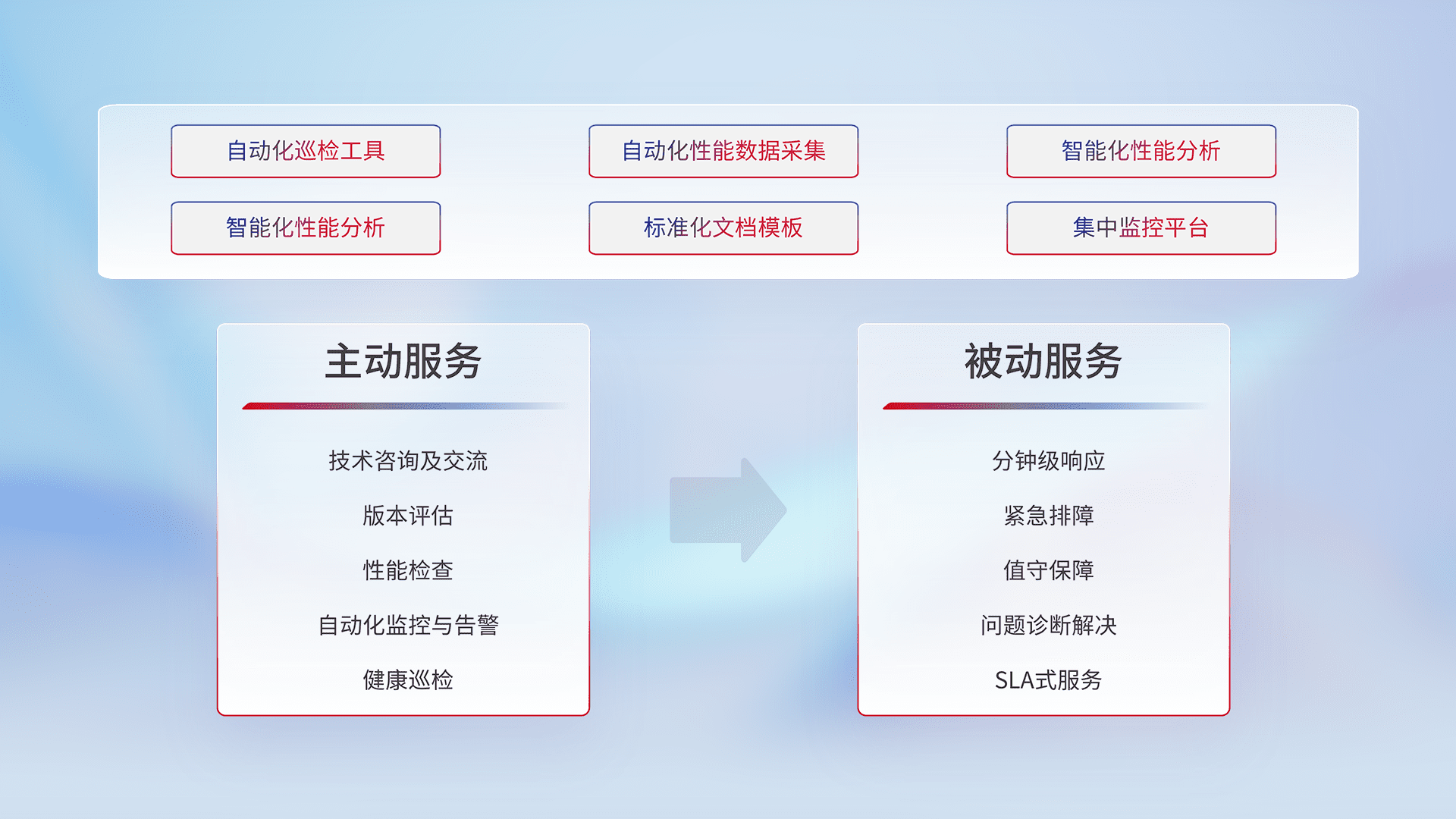 智能化工具和标准化文档,,保障服务质量,,,提供主动服务(包含技术咨询、、版本评估、、、、性能检查、、、、自动化监控与告警、、、、健康巡检)和被动服务包含(分钟级响应、、、紧急排障、、值守保障、、、、问题诊断解决、、SLA服务)。。。。